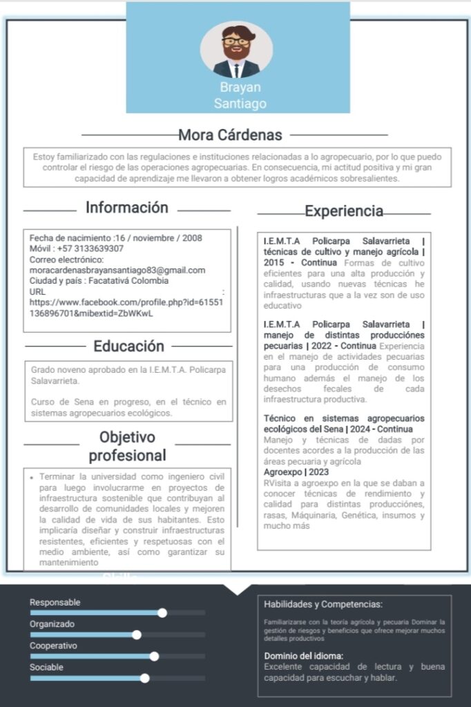 en la siguiente hoja de vida doy a conocer lo que he logrado y en lo que he actuado mostrando mis abilidades y en lo que estoy mejorando además de lo que espero ser en un futuro